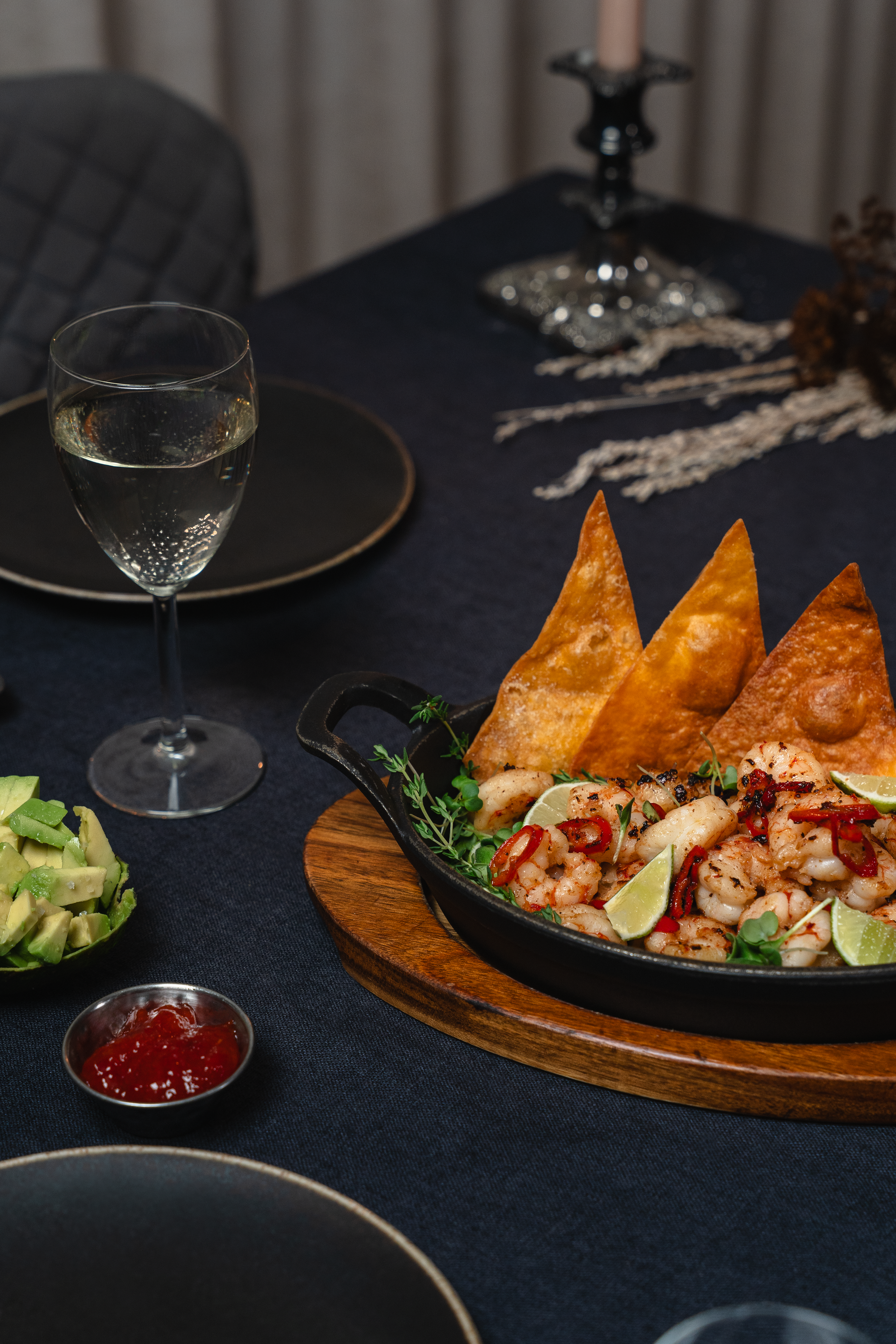 argentískar tígrisrækjur, avocado, chilli sulta, lime, chilli, hvítlauksgeirar, tortilla, salt, olía.