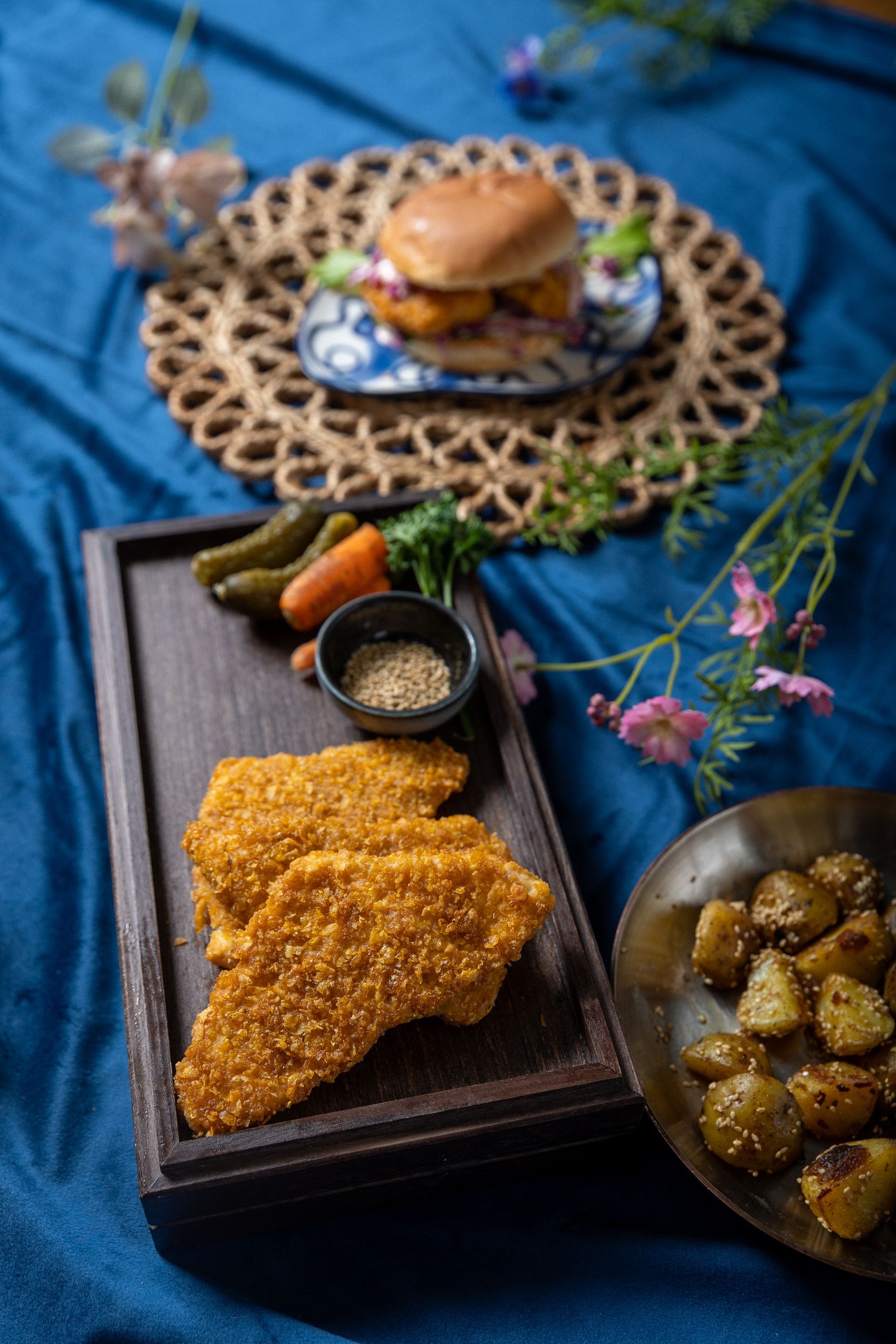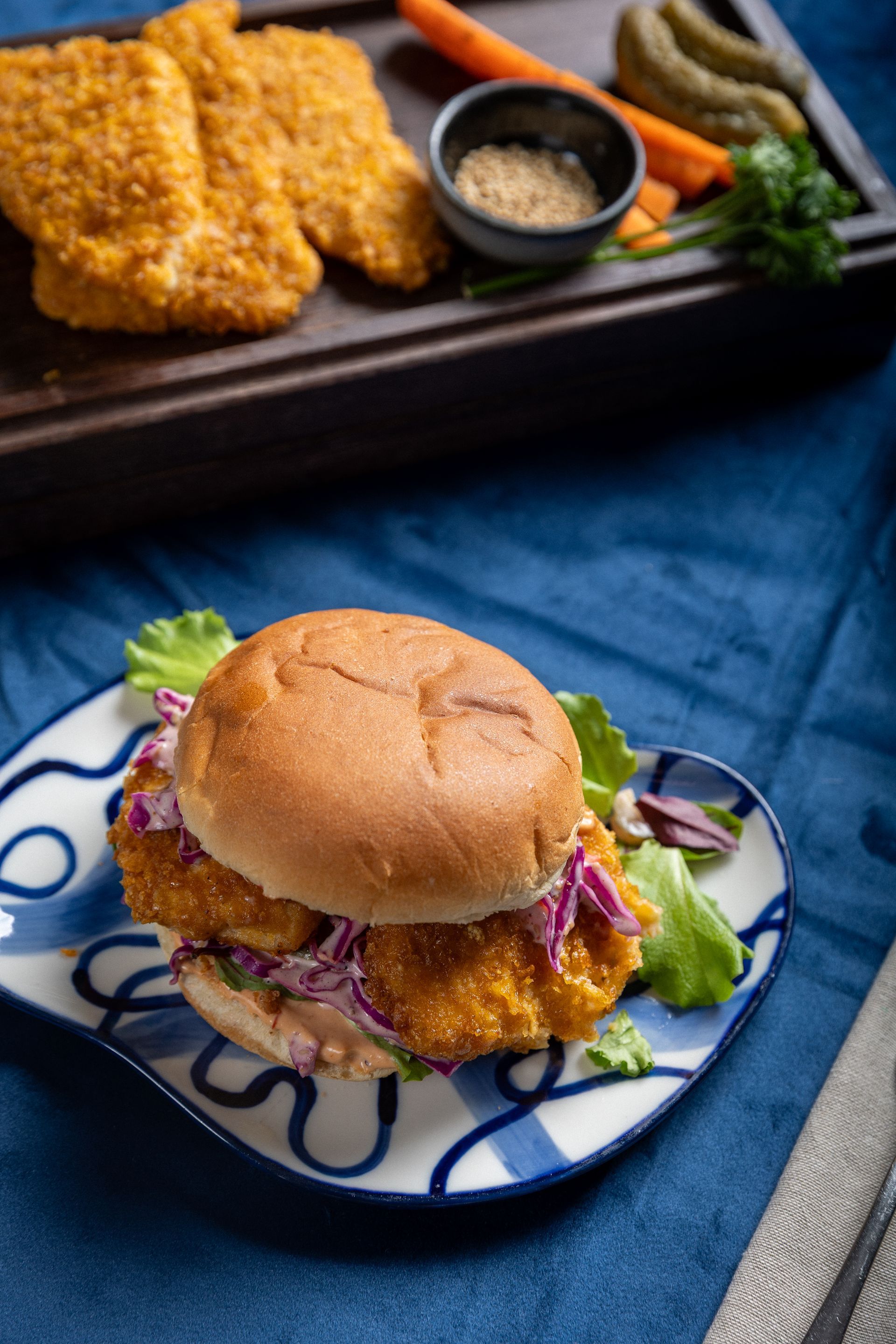 Kornflex Ýsa, brioche hamborgarabrauð, rauðkál, papríka, sweet chilli, mæjónes, sjávarsalt, mulinn pipar