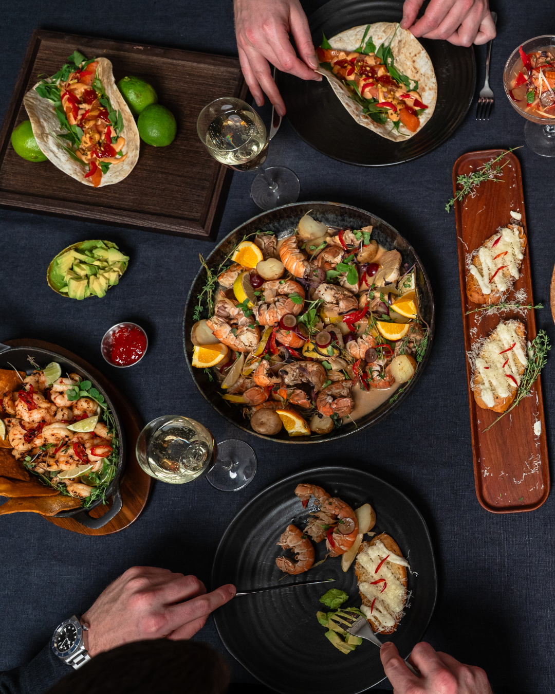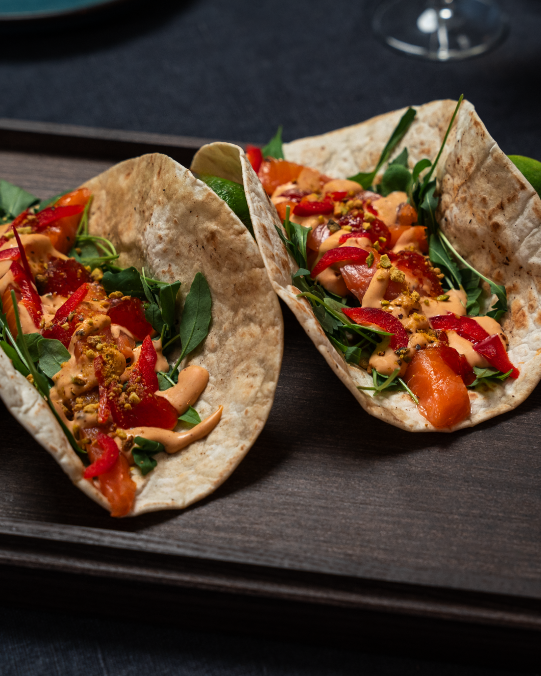 Reyktur lax, tortilla kökur, klettasalat, papríka, eldpiparmauk, mæjónes, pistasíur.